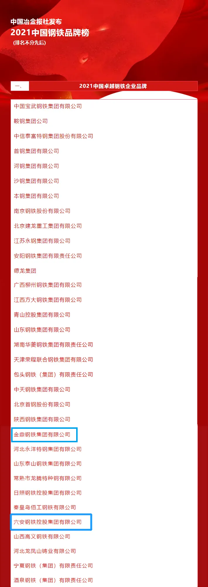 品牌是企業(yè)乃至國家綜合競爭力的重要體現(xiàn)。5月10日,第五個中國品牌日之際,中國冶金報社隆重發(fā)布2021年度中國鋼鐵品牌榜。方同舟控股下屬金鼎鋼鐵集團、六安鋼鐵控股集團雙雙榮膺“2021年度中國卓越鋼鐵企業(yè)品牌”榮譽稱號。