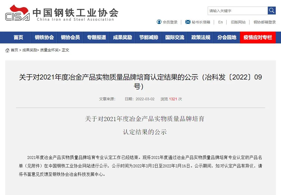近日,中國鋼鐵工業(yè)協(xié)會公布了2021年度冶金產(chǎn)品實物質(zhì)量品牌培育認定產(chǎn)品名單,六安鋼鐵控股集團旗下安徽首礦大昌金屬材料有限公司鋼筋混凝土用熱軋帶肋鋼筋(直條)HRB400E順利通過申報、初審、顧客滿意度調(diào)查、現(xiàn)場實物抽樣檢驗、專業(yè)評審等認定程序,并由鋼鐵工業(yè)協(xié)會審定委員會審定,首次榮獲冶金產(chǎn)品實物質(zhì)量“金杯獎”,實現(xiàn)了“金杯獎”產(chǎn)品零的突破,標志著“六鋼螺紋鋼”成為行業(yè)品牌產(chǎn)品和標桿產(chǎn)品。