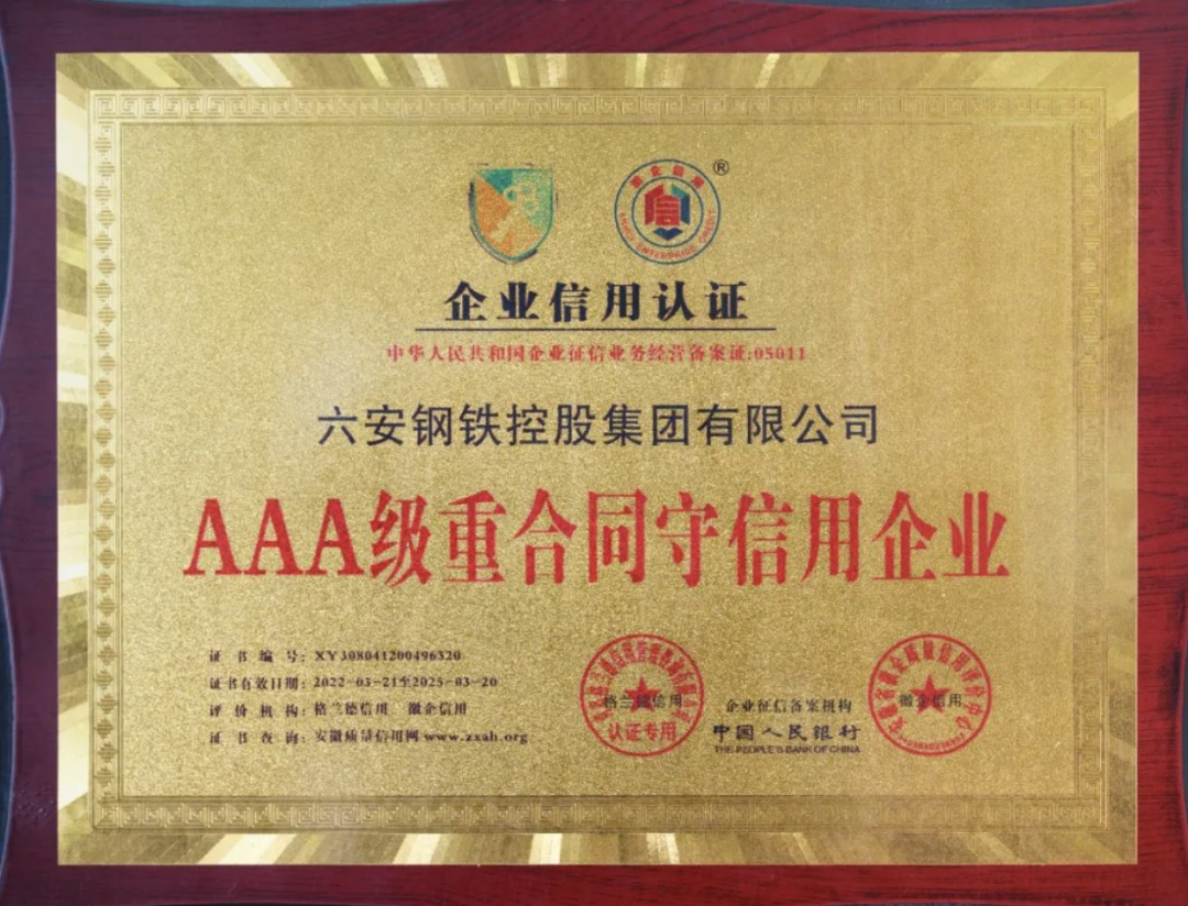 為落實黨中央、國務院關(guān)于加強社會信用體系建設(shè)的決策部署,加快構(gòu)建以信用為核心的新型市場監(jiān)管機制,按照國務院《社會信用體系建設(shè)規(guī)劃綱要(2014-2020年)》的總體要求和安徽省委、省政府《關(guān)于進一步加強社會信用體系建設(shè)的意見》的要求,經(jīng)公司公共事務部申報,六安鋼鐵控股集團順利通過評價認證,榮獲“AAA級重合同守信用企業(yè)”稱號。