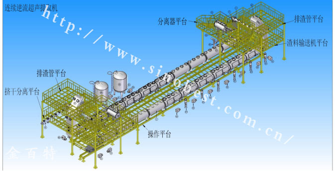 提取裝置,包括多節(jié)超聲提取管、浸泡提取管、螺旋推進(jìn)器、攪拌器、連軸桿和套、驅(qū)動(dòng)電機(jī)減速機(jī)等。